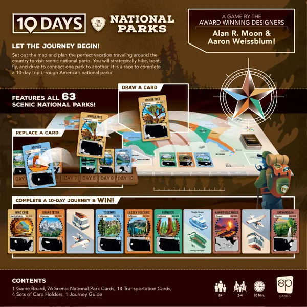 Prepara el mapa y planifica las vacaciones perfectas, recorriendo el país para visitar pintorescos parques nacionales. Caminarás, navegarás, volarás y conducirás estratégicamente para conectar un parque con otro. ¡Es una carrera para completar un viaje de 10 días por los Parques Nacionales de Estados Unidos!