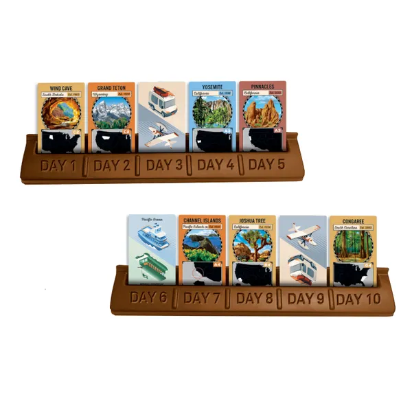 Hay 76 cartas de Parques Nacionales Escénicos, 14 cartas de Transporte (8 cartas de Caravana/Avión de doble cara; 6 cartas de Barco del Océano Pacífico/Atlántico de doble cara). Los jugadores dan la vuelta a las fichas una a una, las examinan y las colocan en cualquier casilla de día disponible de los 10 “días” de su bandeja, en cualquier orden. Luego, por turnos, roban una ficha de una de las tres pilas boca arriba o de una pila boca abajo. La nueva ficha puede reemplazar una ficha de su bandeja, y la ficha reemplazada (o la ficha robada sin usar) se descarta en cualquiera de las pilas boca arriba. Cuando un jugador conecta todos sus días correctamente, gana la partida.
