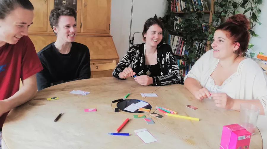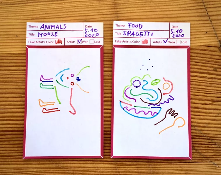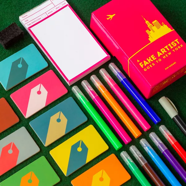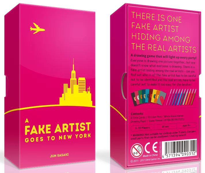 El juego “El Artista Falso Va a Nueva York” es un juego de mesa para 5 a 10 jugadores. Los jugadores se turnan para ser el Maestro de las Preguntas, cuyo rol consiste en establecer una categoría, escribir una palabra de esa categoría en tarjetas borrables y repartirlas a los demás jugadores como artistas. Al mismo tiempo, un jugador tendrá solo una “X” escrita en su tarjeta: ¡ese es el artista falso!