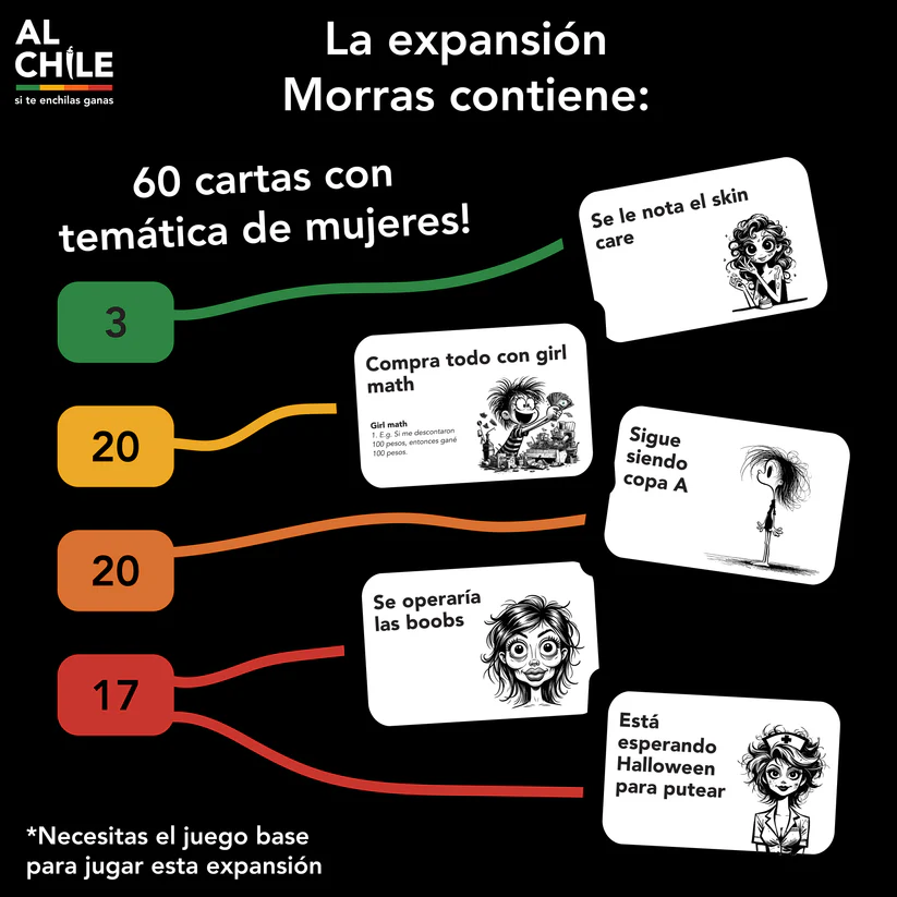 La expansión "Morras" amplía el juego de mesa base "Al Chile" con 60 nuevas cartas de cuatro niveles de intensidad (verde, amarillo, naranja y rojo), orientadas a mujeres.