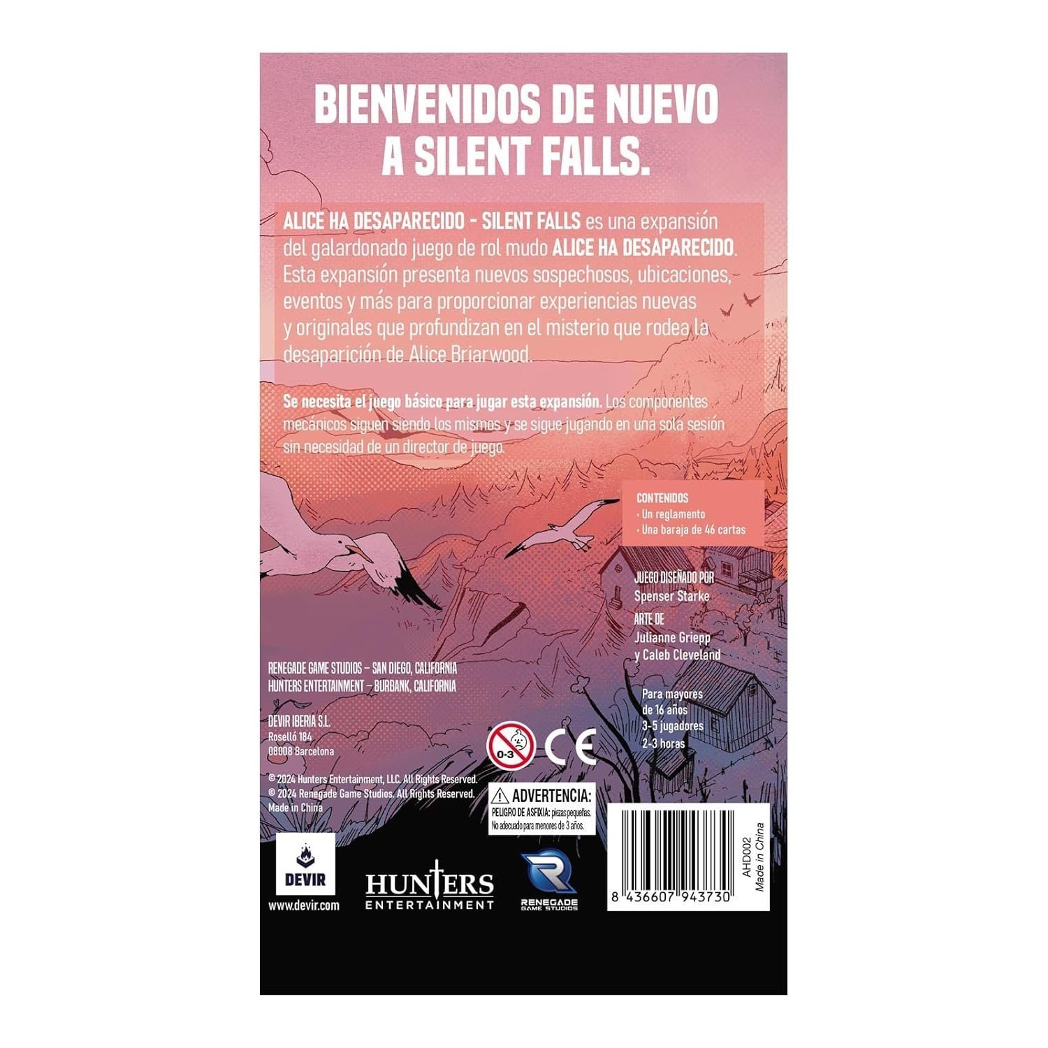 Alice ha desaparecido: Silent Falls es una expansión para el aclamado juego de rol mudo Alice ha desaparecido, diseñado para sumergir a los jugadores en una nueva capa de misterio y emoción. Esta expansión amplía el universo del juego original, añadiendo nuevas opciones, eventos y personajes que profundizan aún más en la desconcertante desaparición de Alice Briarwood. Si eres fan del juego base, esta expansión te ofrecerá una experiencia fresca y cautivadora, ideal para grupos que buscan nuevos desafíos mientras resuelven este intrigante caso.