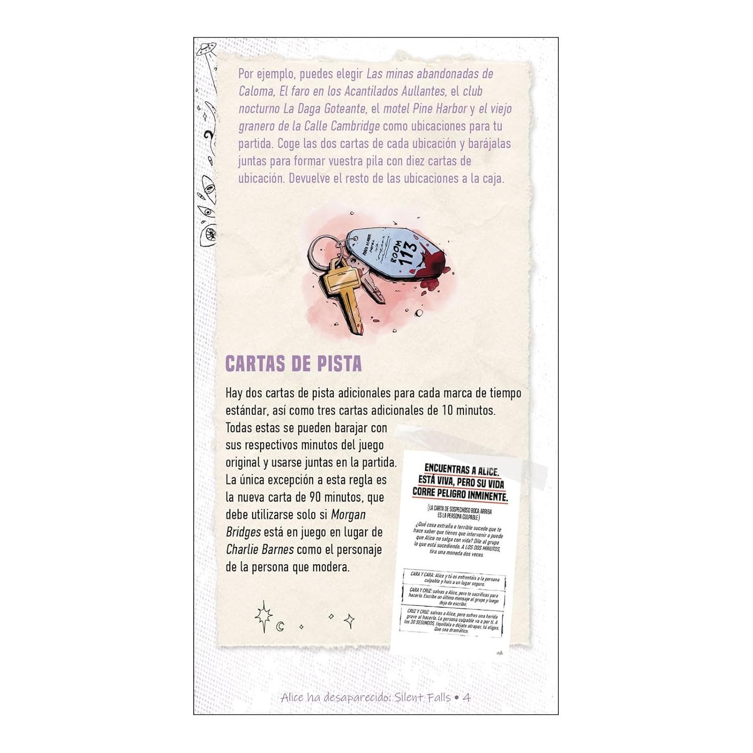 Es importante tener en cuenta que esta expansión no puede jugarse de manera independiente. Para disfrutar de  Silent Falls, necesitas el juego base Alice ha desaparecido. Los jugadores seguirán usando la misma mecánica de juego, que se centra en la colaboración, la toma de decisiones y la resolución de acertijos sin la necesidad de un director de juego. Esto permite que todos los jugadores estén completamente inmersos en la narración y la resolución del misterio durante una sola sesión.