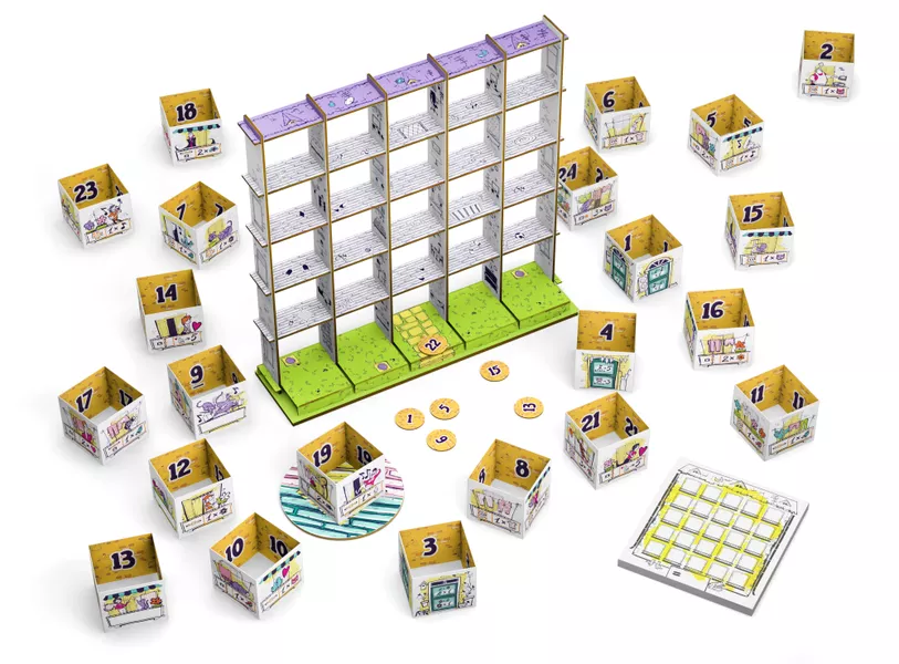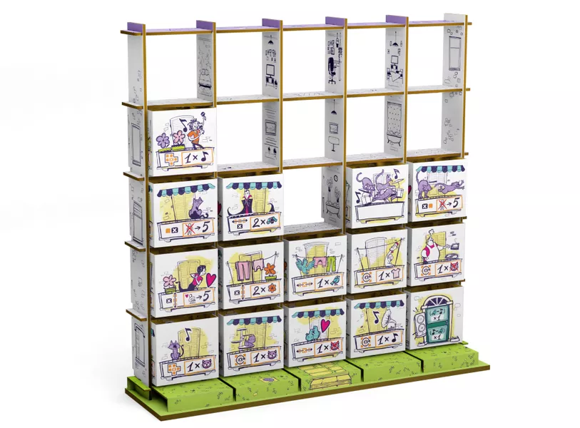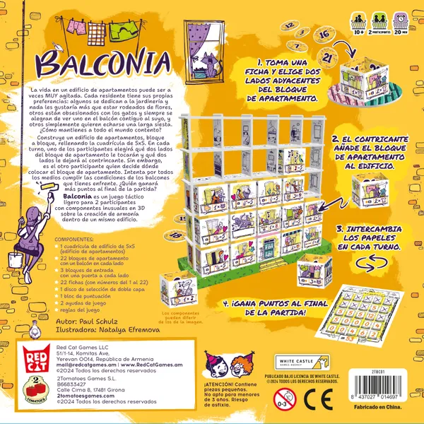 La vida en un edificio de apartamentos puede ser a veces MUY agitada. Cada residente tiene sus propias preferencias: algunos se dedican a la jardinería y nada les gustaría más que estar rodeados de flores, otros están obsesionados con los gatos y siempre se alegran de ver uno en el balcón contiguo al suyo, y otros simplemente quieren echarse una larga siesta. ¿Cómo mantienes a todo el mundo contento? Construye un edificio de apartamentos, bloque a bloque, rellenando la cuadrícula de 5х5. En cada turno, uno de los participantes elegirá qué dos lados del bloque del edificio le tocarán y qué dos lados le dejará al contricante. Sin embargo, es el otro participante quien decide dónde colocar el bloque de construcción. Intenta por todos los medios cumplir las condiciones de los balcones que tienes enfrente. ¿Quién ganará más puntos al final de la partida? Balconia es un juego táctico ligero para 2 participantes con componentes inusuales en 3D sobre la creación de armonía dentro de un mismo edificio.