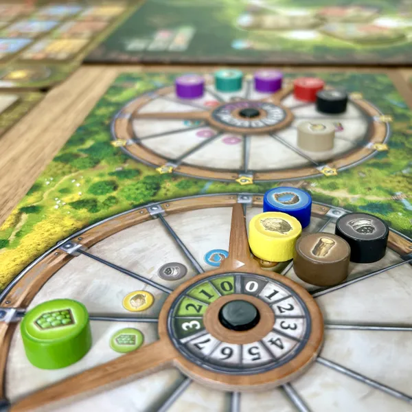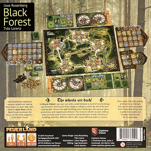 Las ruedas de recursos de Uwe Rosenberg, famosas en Glass Road (2013), regresan en Black Forest. Dos ruedas de recursos en tu tablero te ayudan a controlar tus recursos y producción. Black Forest continúa la historia, como su nombre indica, en Black Forest. Entre otras, la principal diferencia entre ambos juegos es el uso de la colocación de trabajadores en Black Forest en lugar de la selección de acciones simultáneas.