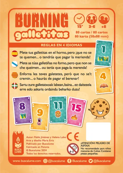Añade una galletita a la bandeja. Y luego otra, y otra… El color tiene que ser siempre diferente y el número superior a la anterior. Aunque también puedes jugar cartas ocultas y trucos especiales. Si fallas, te llevas las galletitas quemadas a casa y tendrás que pagar la merienda.