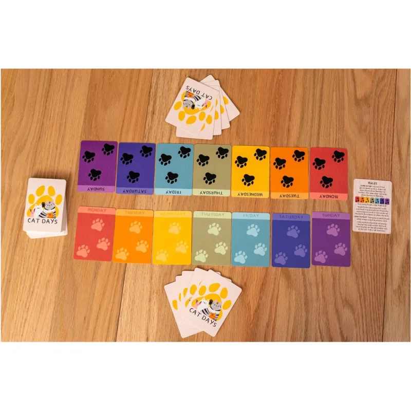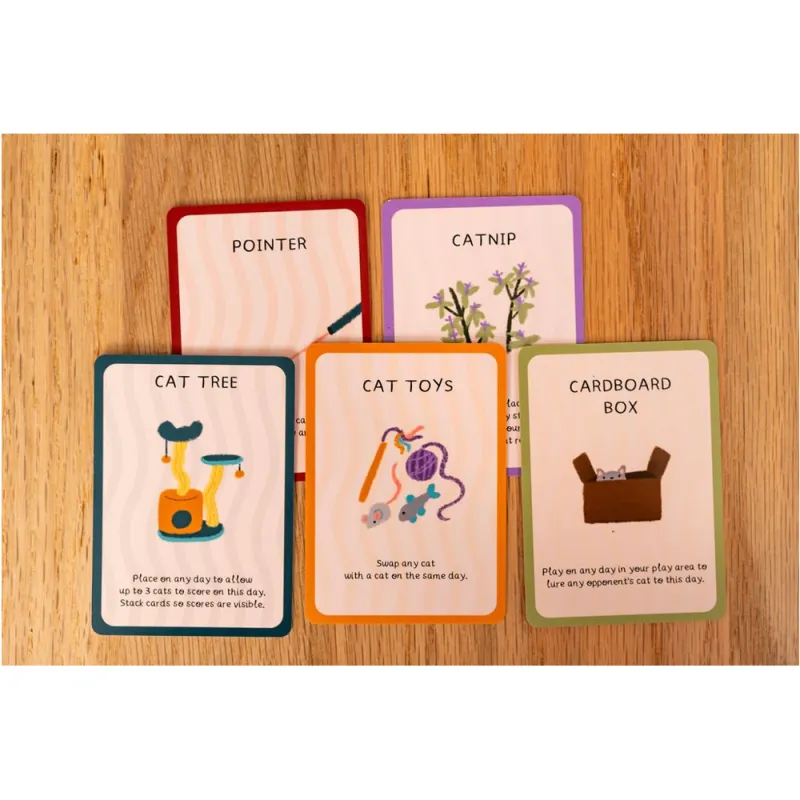 Llena tu semana de gatos, consiguiendo la mayor puntuación posible. Cada gato tiene reglas de juego únicas: algunos anulan puntos, otros permiten intercambiar gatos, y otras cartas especiales afectan al juego, como el rascador para gatos que permite que varios gatos puntúen el mismo día, o la caja de cartón que te permite robar un gato para tu semana. Se necesita una baraja por cada dos jugadores.