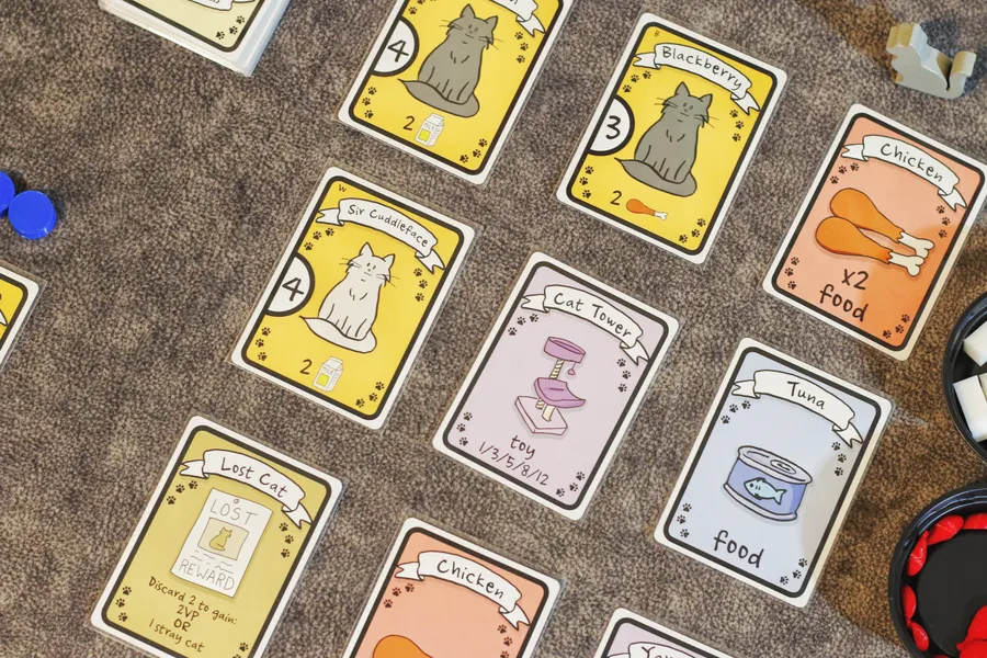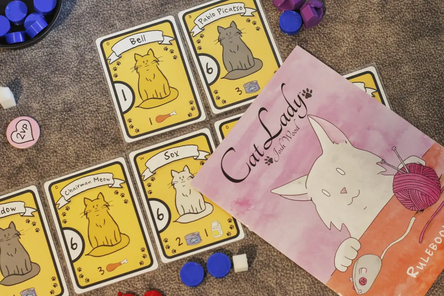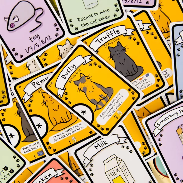 En Cat Lady, las jugadoras son damas gatas, parte de un grupo selecto que incluye a María Antonieta y Ernest Hemingway. Durante la partida, tú y tus compañeras damas gatas elegirán cartas de tres en tres, recolectando juguetes, comida, hierba gatera, disfraces y, por supuesto, adorables gatos. ¡Pero cuidado! Asegúrate de tener suficiente comida para todos tus amigos felinos o tus gatos hambrientos te restarán puntos. ¡El jugador con más puntos de victoria gana!