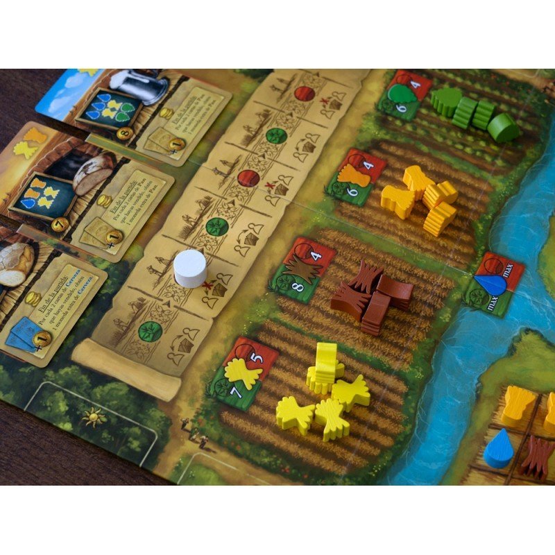 Cerveza y Pan es un juego de tablero donde tendrás que enfrentarte a una lucha entre dos aldeas que tienen como tradición hacer cerveza y pan artesanal. Cada jugador tendrá que optimizar sus habilidades y acciones para equilibrar su producción de pan y cerveza. Durante 6 años, tendrás que ir produciendo cosechas y almacenando pan y cerveza, venderlo y mejorar las instalaciones. Para ganar, tienes que tener un equilibrio entre los productos líquidos y los horneados porque a partir del sexto año solo puntúan monedas recogidas de estos productos por el que hayas ganado menos. ¡Ganará el pueblo con la puntuación más alta!
