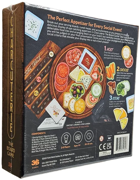 Prepare sus tablas para servir, carnes curadas y accesorios mientras se prepara para crear una deliciosa exhibición de llamativos aperitivos en Charcuterie: The Board Game.