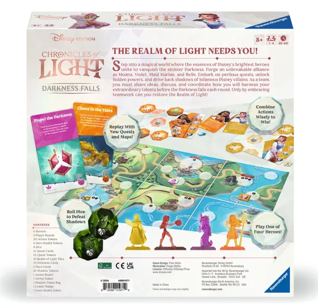 En Chronicles of Light: Darkness Falls (Disney Edition), los jugadores trabajan juntos para formar alianzas dinámicas de heroínas de Disney y Pixar, incluidas Moana (Moana), Violet (Los Increíbles), Maid Marian (Robin Hood) y Bella (La Bella y la Bestia).