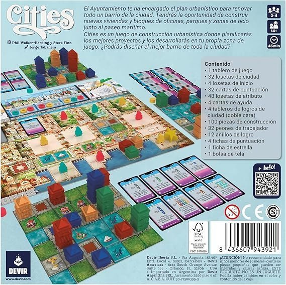 La caja de Cities viene repleta de componentes para que la experiencia de juego sea lo más inmersiva posible: 100 piezas de construcción de distintos colores, 32 peones de trabajador, 12 anillos de logro, más de 100 losetas… Todas las herramientas necesarias para crear el mejor plan urbanístico para tu barrio. Y todo ello decorado con un estilo muy colorista, repleto de detalles, obra de Jorge Tabarnera. Una experiencia lúdica apta para cualquier tipo de jugador (el reglamento solo tiene 4 páginas, ¡así que prepárate para abrir la caja y ponerte a jugar!), con partidas de menos de una hora. ¿Podrás diseñar el mejor barrio de toda la ciudad?