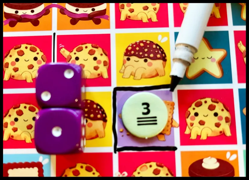 Cada jugador tiene su tablero personal y un juego de fichas numéricas. Al principio del juego, coloca tus fichas numéricas sobre las galletas del tablero. En tu turno, tira el dado y, a la vez, todos eligen dónde añadir líneas alrededor de la galleta donde colocaron la ficha. La cantidad de líneas que añadas dependerá del número que saques: cuanto menos común sea el número, más líneas dibujarás. Todos pueden mover una ficha a otro lugar en su tablero, ¡y luego es hora de volver a tirar!
