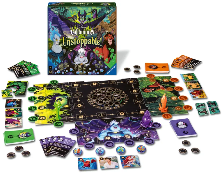 En ¡Disney Villainous Imparable!, te pondrás en la piel de uno de los cuatro famosos villanos de Disney: Maléfica, Úrsula, Hades o Scar, y deberás usar astutamente tus habilidades especiales para llevar a cabo tu malvado plan y frustrar a tus oponentes.