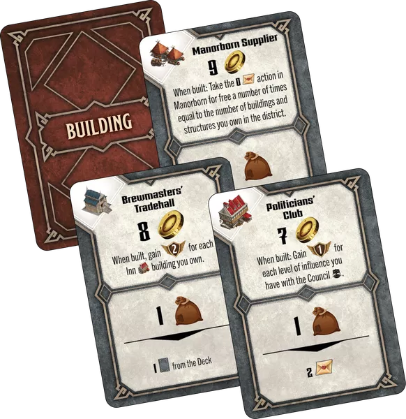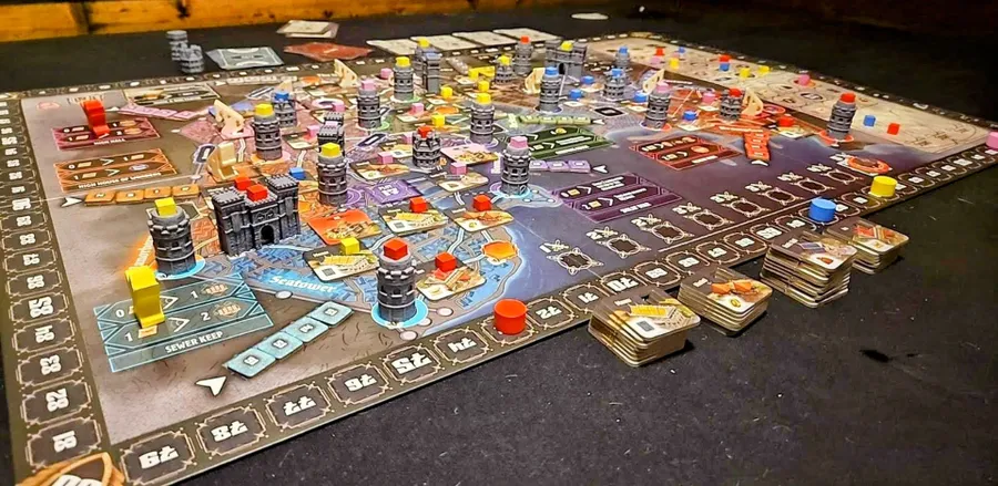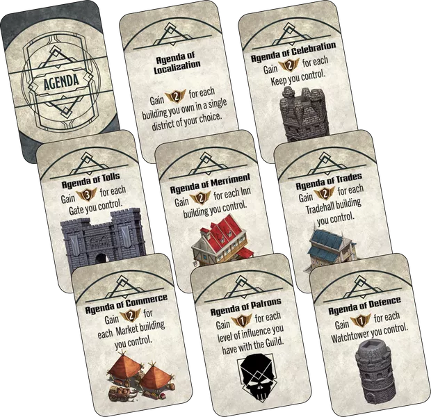 Al colocar edificios, colocas un cubo de influencia sobre ellos para indicar tu control. ¡Esto también se aplica a fortalezas especiales, puertas y torres de vigilancia, que están representadas por miniaturas con ranuras para tus cubos de influencia, lo que te permite ver crecer la ciudad en tres dimensiones!