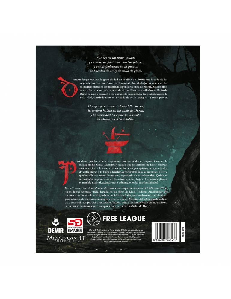 Durante largas edades, la gran ciudad de la Mina del Enano fue la sede de los reyes de los enanos. Cavaron demasiado hondo bajo las raíces de las montañas en busca de mithril, la legendaria plata de Moria. Allí forjaron maravillas, a la luz de lámparas de vidrio. Pero hace mil años, el Daño de Durin se alzó y expulsó a los enanos de sus salones. La ciudad cayó en la oscuridad, convirtiéndose en morada de orcos, trasgos… y cosas peores.