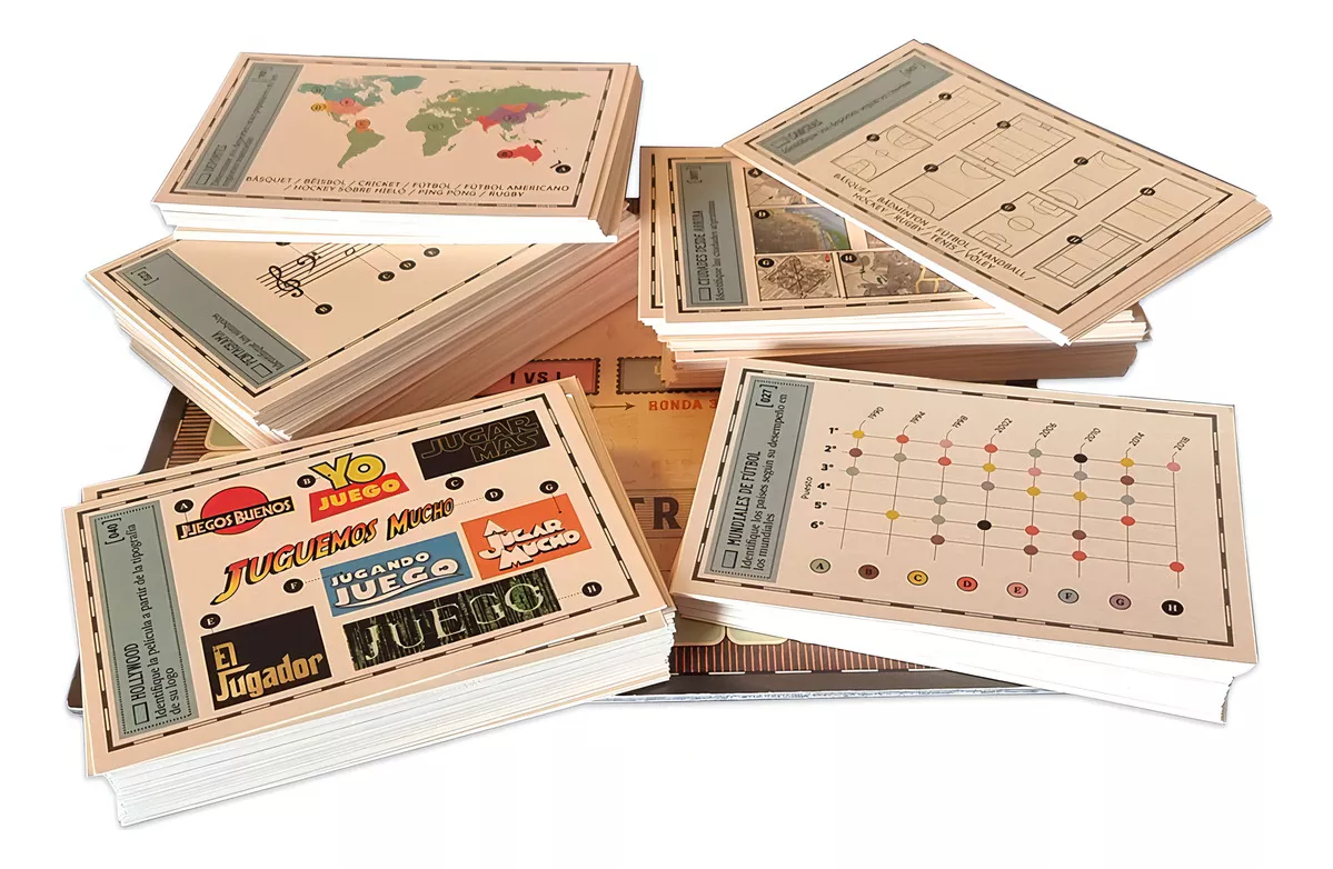 En las tarjetas ilustradas hay que reconocer, ubicar e identificar, ordenar o clasificar diferentes elementos para demostrar todo lo que sabes. El juego cubre diversos temas y no es solo para sabelotodos del conocimiento académico: tipos de baile, discos de bandas, canchas de deportes, marcas, países y hasta herramientas.