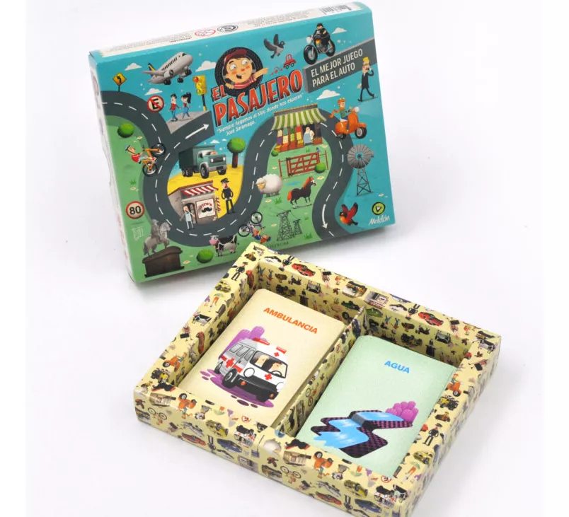 Un juego ideal para tener en la guantera del carro. Consiste en dos mazos de 40 cartas, uno para la ruta y otro para la ciudad, con ilustraciones que los chicos deben encontrar mirando a través de la ventana del carro. Se puede jugar solo, en equipo o con todos los pasajeros del auto.