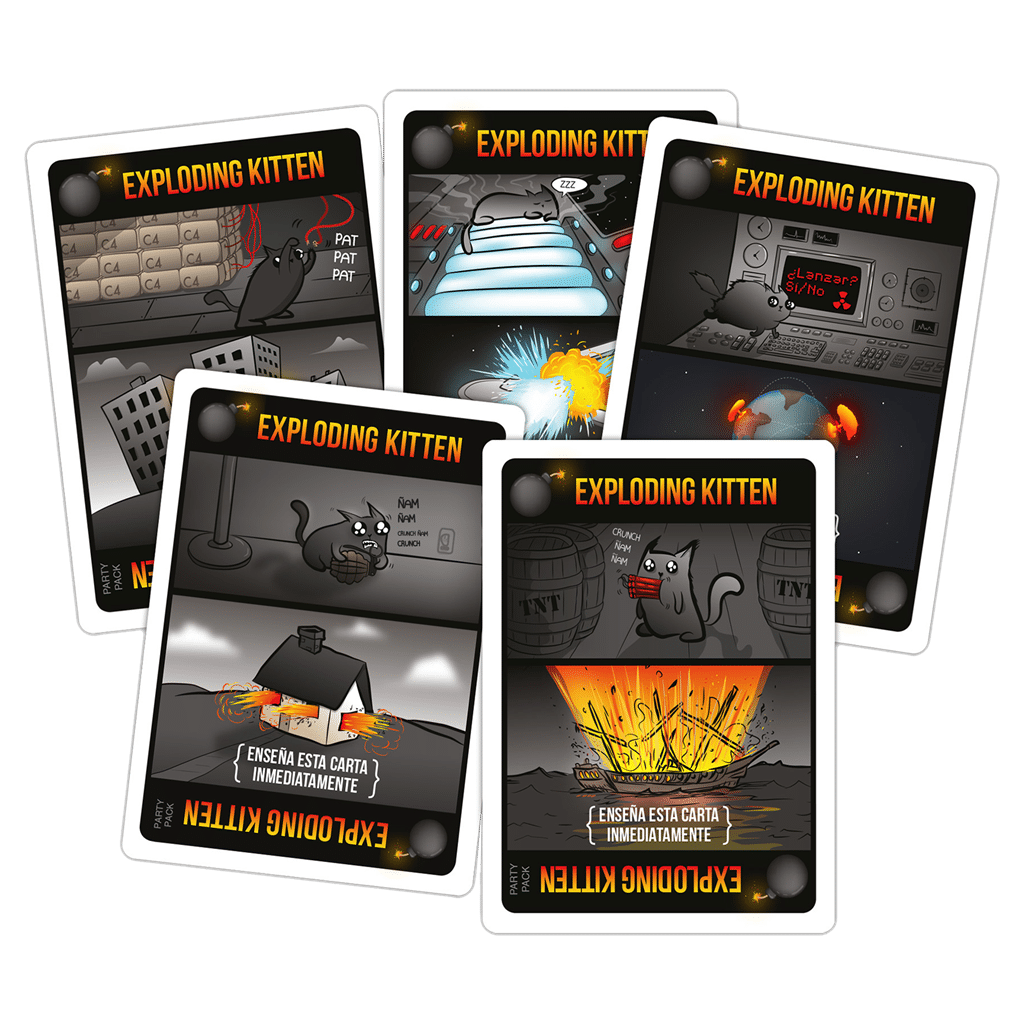 Se trata de una versión gatuna de la ruleta rusa con un gran componente estratégico. Los jugadores van robando cartas hasta que a alguien le sale un Exploding Kitten. Cuando esto sucede, esa persona muere y queda eliminada de la partida a no ser que tenga una carta de Desactivación, que anulará el efecto del Exploding Kitten con punteros láser, rascaditas de barriga y sándwiches de atún.
