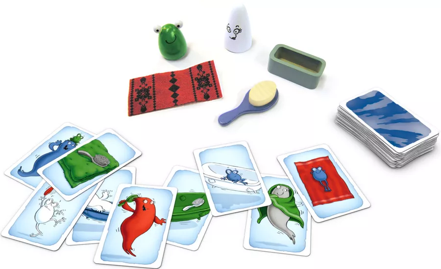 Fantasma Blitz 2.0 es la nueva versión con diferentes objetos de madera esperando a ser capturados: un fantasma blanco, una rana verde, una bañera gris, un cepillo azul y una toalla roja.