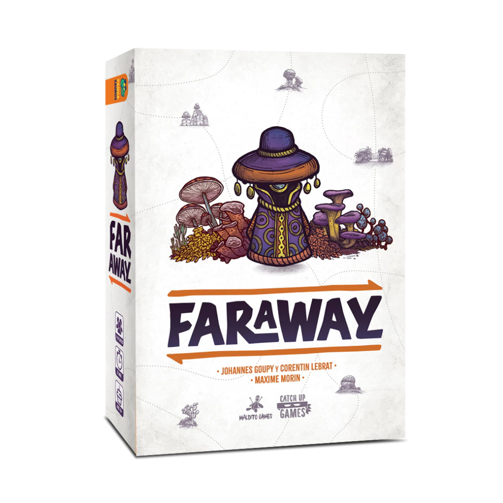 Faraway es un juego de cartas donde descubrirás un nuevo continente. Planifica muy bien tu viaje para poder descubrir las maravillas escondidas, conocer a sus habitantes, revelar sus secretos y ganar más fama que tus oponentes. Alula es un continente muy misterioso y que siempre está cambiando al ritmo de las estaciones. A lo largo de la partida, jugarás una fila de 8 cartas de izquierda a derecha, las cuales representan las regiones que irás encontrando mientras exploras las tierras. Obtendrás puntos de victoria gracias a los personajes de las cartas si cumples con las condiciones exigidas. Cuando termine la partida, volverás por el mismo camino y anotarás las cartas en orden inverso a las que ya has jugado. En cada turno, juegas una carta de una mano de tres, y luego eliges una nueva carta de un río boca arriba. Tendrás que tener en cuenta un sistema de prioridades acorde a tus elecciones: ser el último en elegir una carta te deja con menos opciones, seguramente menos rentables para los siguientes turnos.