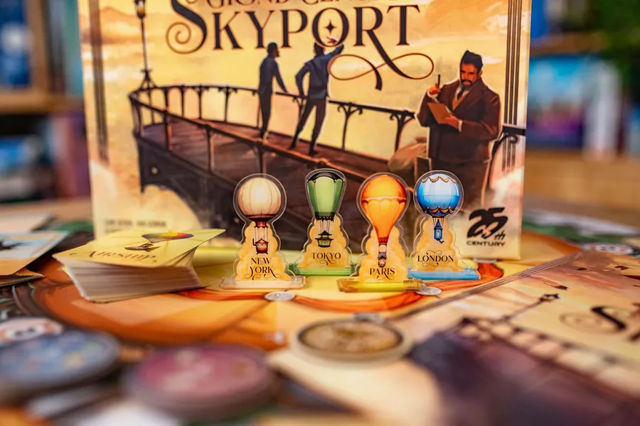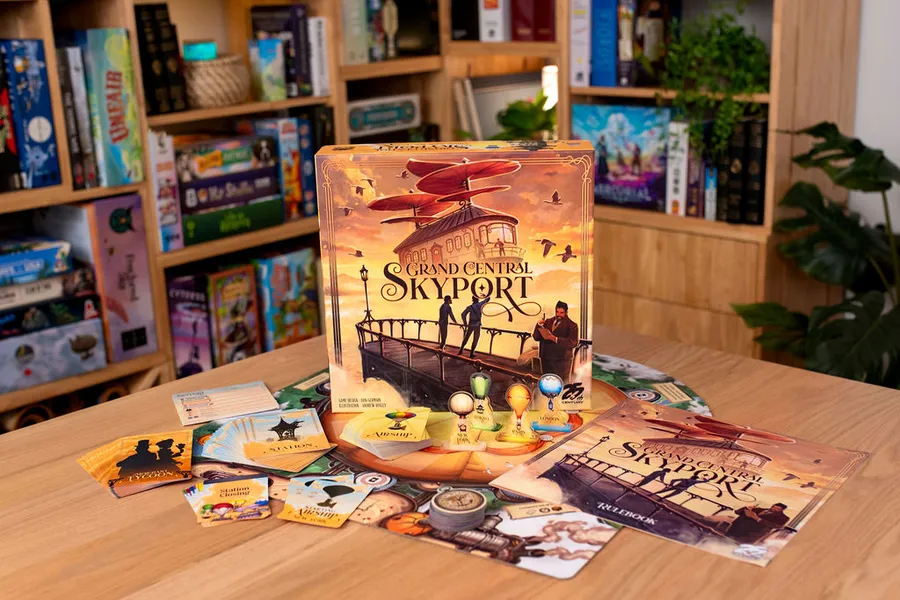 En Grand Central Skyport, quieres operar eficientemente tu estación de dirigibles y atraer a los magnates más prestigiosos a tu ciudad. Durante la partida, atraerás nuevos dirigibles a tu puerto, cada uno con un color y un movimiento inicial. Intenta maniobrar tus dirigibles para agruparlos por color y que se apilen para sumar cada vez más puntos. Desafortunadamente, con cada nueva nave que entra en tu estación, su movimiento provocará la reorganización de los dirigibles previamente colocados, así que lo ideal es competir con otros propietarios de puertos aéreos alrededor de un rondel central para elegir los dirigibles que mejor se adapten a ti.