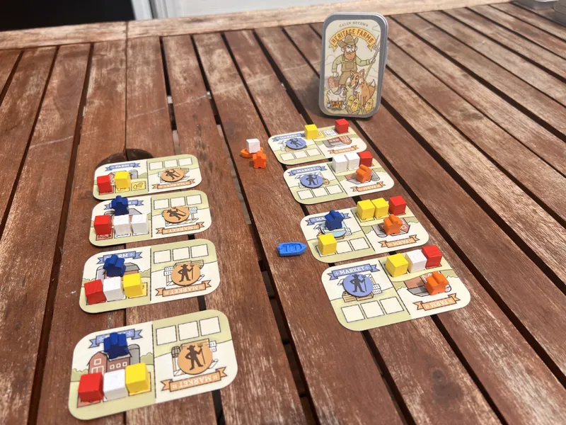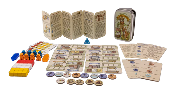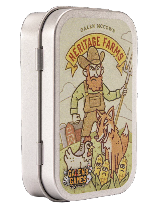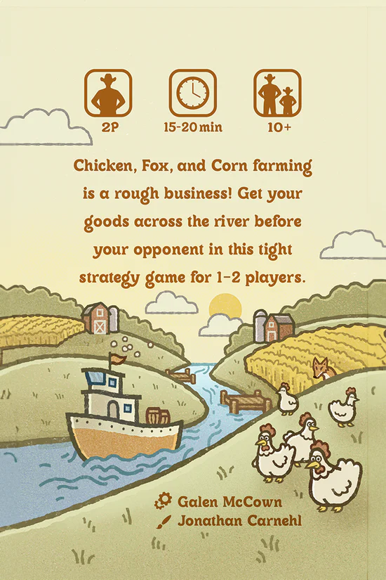 Este es un juego de mesa de Mint Tin basado en el clásico acertijo del granjero que necesita cruzar el río con su gallina, zorro y maíz, con espacio para solo uno en la barca a la vez. Si dejas a la gallina y al zorro solos, la gallina será devorada. Si dejas a la gallina con el maíz solo, el maíz será devorado. La particularidad de este juego es que puedes colocar al otro jugador vigilando tus recursos junto con los suyos. ¡Los jugadores compiten por ser los primeros en cruzar el río con 2 conjuntos de gallina, zorro y maíz!