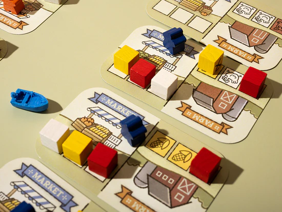 Al entregar tu granjero al mercado, revelas la bonificación del mercado. La cobras cuando tu granjero abandona esa carta. Las bonificaciones de mercado te otorgan poderosas habilidades de un solo uso, como mover el barco de tu oponente, colocar 2 granjeros en una carta, mover un bien hacia arriba o hacia abajo en una carta, o mover un granjero hacia arriba o hacia abajo en una carta.