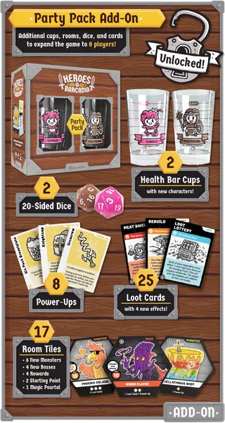 Mejora aún más tu juego base con este pack de fiesta. Dos aventureros más se han unido al grupo desde las afueras de Barcadia. Amplía aún más tu mazmorra, lucha contra monstruos adicionales, consigue más potenciadores para mejorar las habilidades de tu personaje y usa cartas de botín para evitar que tus oponentes lleguen primero al Gran Guardián de la Bebida.