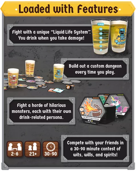 Heroes of Barcadia es un juego de mesa para fiestas de 2 a 6 jugadores, basado en fichas, que explora mazmorras con un toque líquido: la salud de tu personaje se mide por la bebida en tu vaso. Utiliza el Sistema de Vida Líquida™ para determinar los PV, y el líquido que le pongas depende de ti. ¿Usarás refresco, agua, alcohol u otra bebida de tu elección?