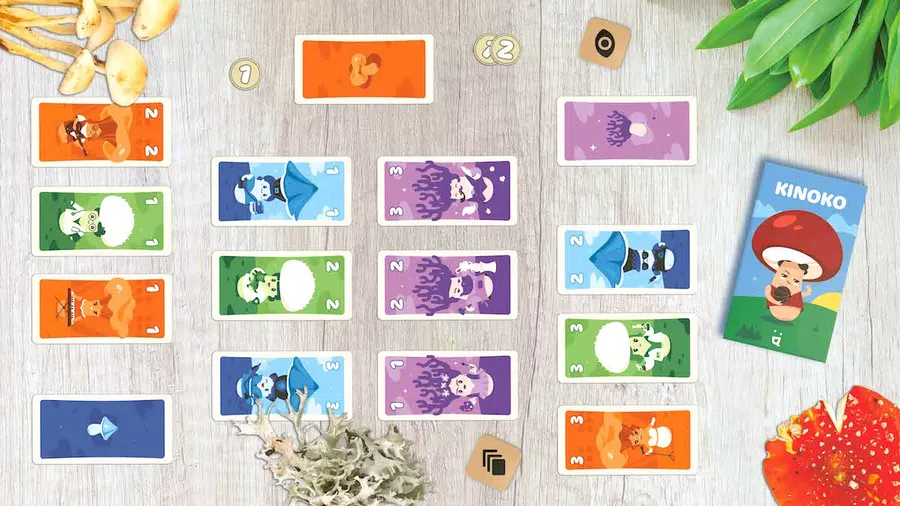 En Kinoko, cada jugador roba en secreto una carta de color que corresponde a una familia de hongos (músicos, científicos, etc.) y recibe tres cartas de hongos en la mano.