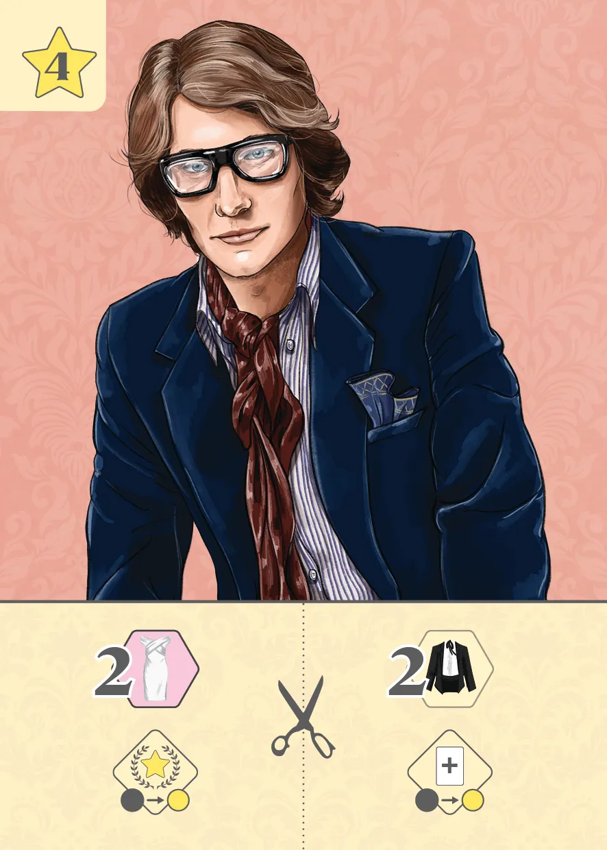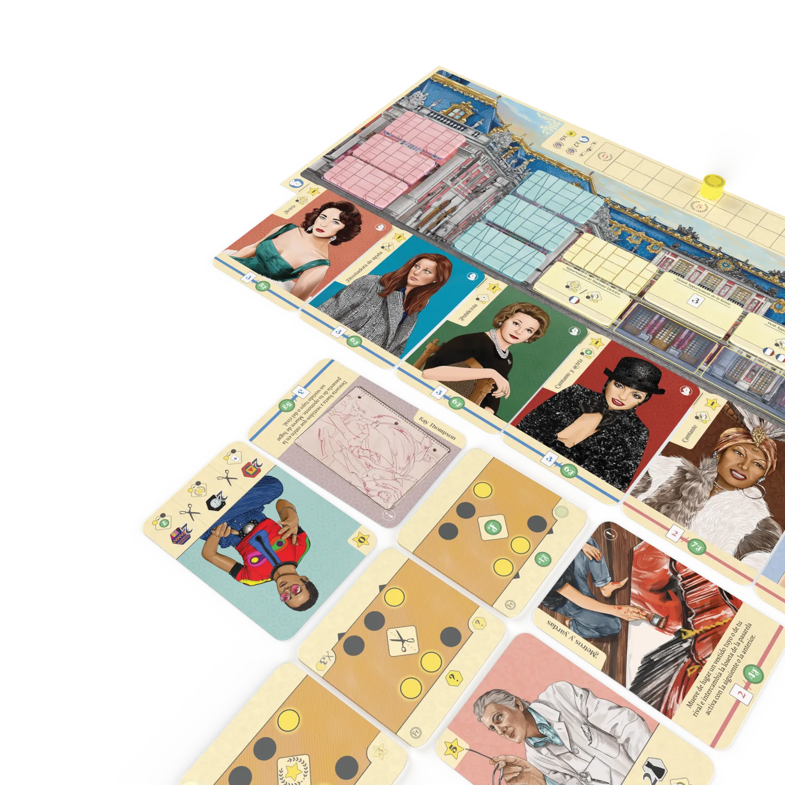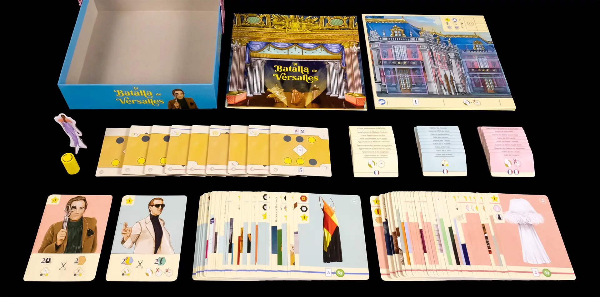La Batalla de Versalles es un juego de cartas basado en 1973, una época en la que el mundo estaba sufriendo muchos cambios, entre ellos, la moda. Los diseñadores franceses se enfrentaron a los estadounidenses para recaudar dinero y, así, restaurar el palacio francés. La diferencia entre las dos nacionalidades se centraba en que los franceses eran más tradicionales que los estadounidenses. Como es un juego para dos jugadores, uno tomará la ideología de los franceses y el otro jugador, la de los estadounidenses. Expondréis vuestros mejores vestidos para atraer muchos celebrities, además de aportar algo para la reconstrucción del palacio. ¡Conviértete en el mejor modista y gana al país contrario!