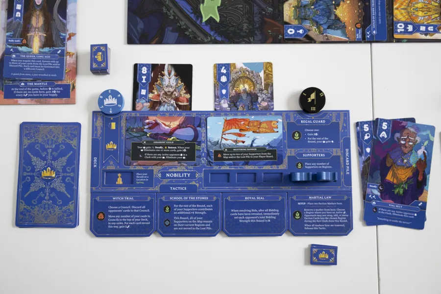 The Old King’s Crown es un juego de mesa sobre la realeza, los rebeldes y las artimañas. El juego se centra en un juego estratégico de bajo riesgo, con pujas, faroles y gestión de manos. Incluye combinaciones de cartas y creación de motores, poderes de jugador únicos y control de área.