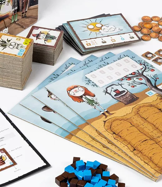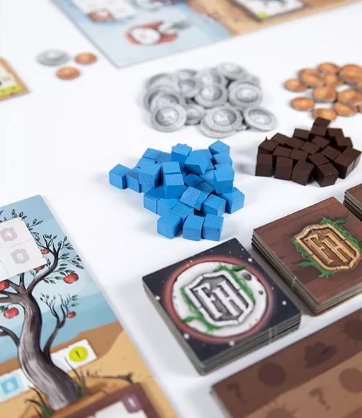 El juego contiene: 4 tableros distintos con 2 caras; 41 fichas de cultivos, utensilios y animales; 6 tarjetas de ronda; 64 contadores de agua y abono; 48 monedas; 4 marcadores de experiencia; reglamento trilingüe.