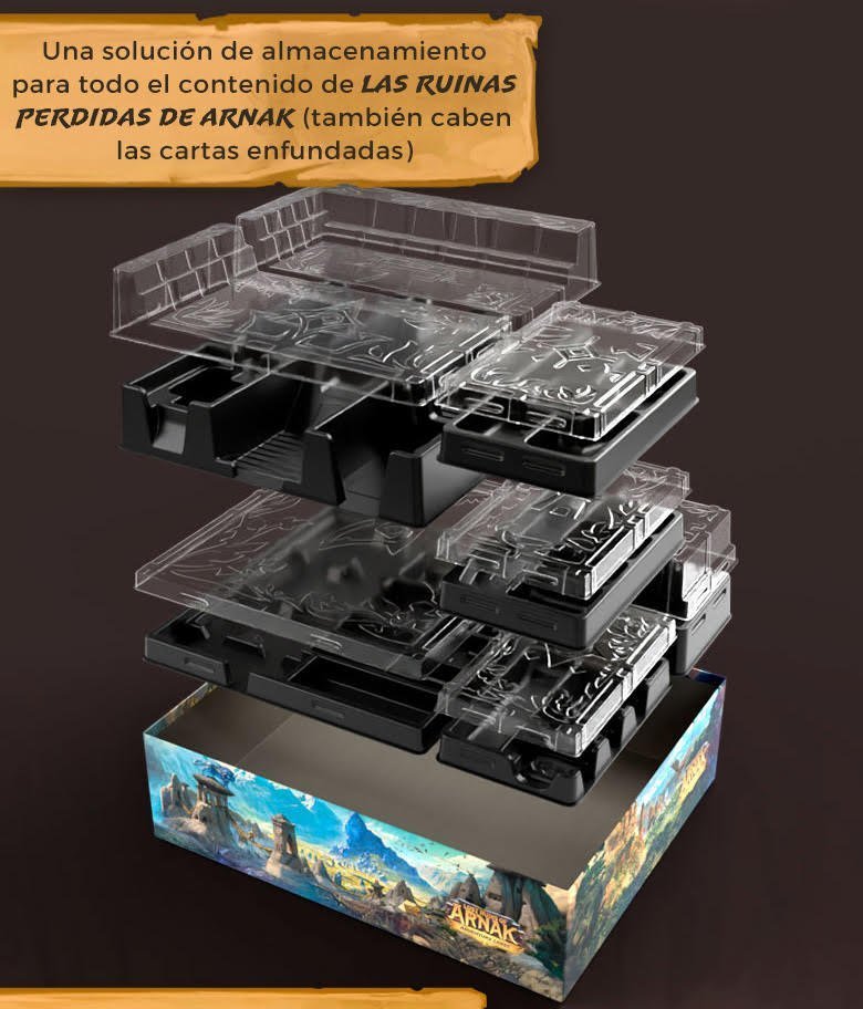 Mantén tu colección en perfecto orden con un sistema de almacenamiento optimizado que acomoda todo el contenido publicado hasta la fecha de Lost Ruins of Arnak, incluyendo: