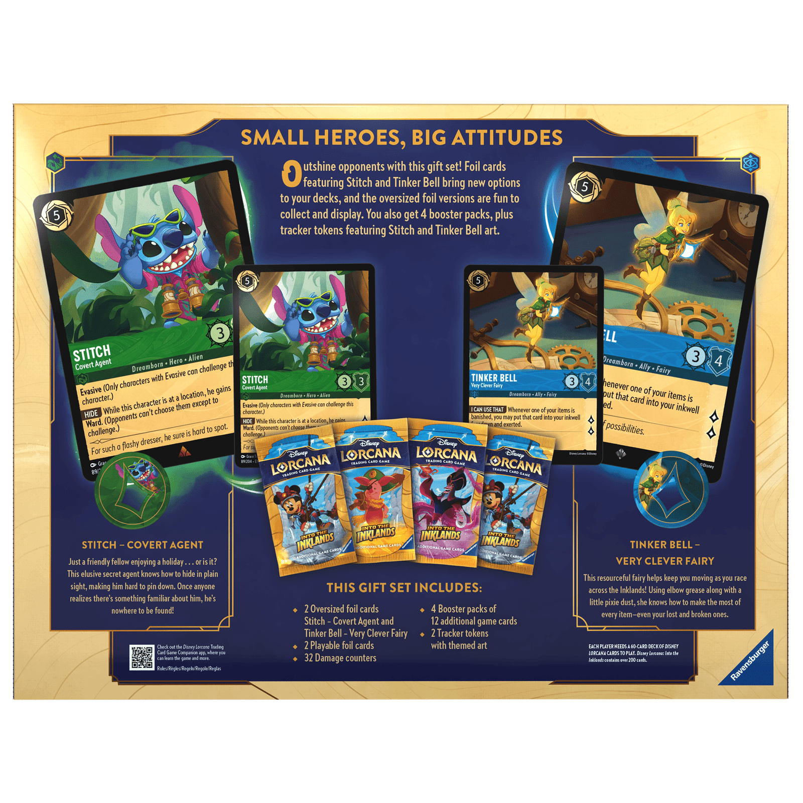 Este Pack incluye 2 cartas gigantes foil, 2 cartas jugables exclusivas, 32 contadores de daño, 4 sobres booster y 2 tokens de lore.