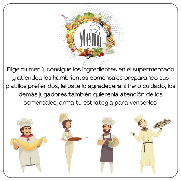 Elige tu menú, consigue los ingredientes en el supermercado y atiende a los hambrientos comensales preparando sus platillos preferidos, ¡ellos te los agradecerán! Pero cuidado: los demás jugadores también buscarán conquistar a los comensales. ¿Tratarás de atender a todos los comensales u optarás por acabar con la competencia? ¡Tú decides la estrategia!