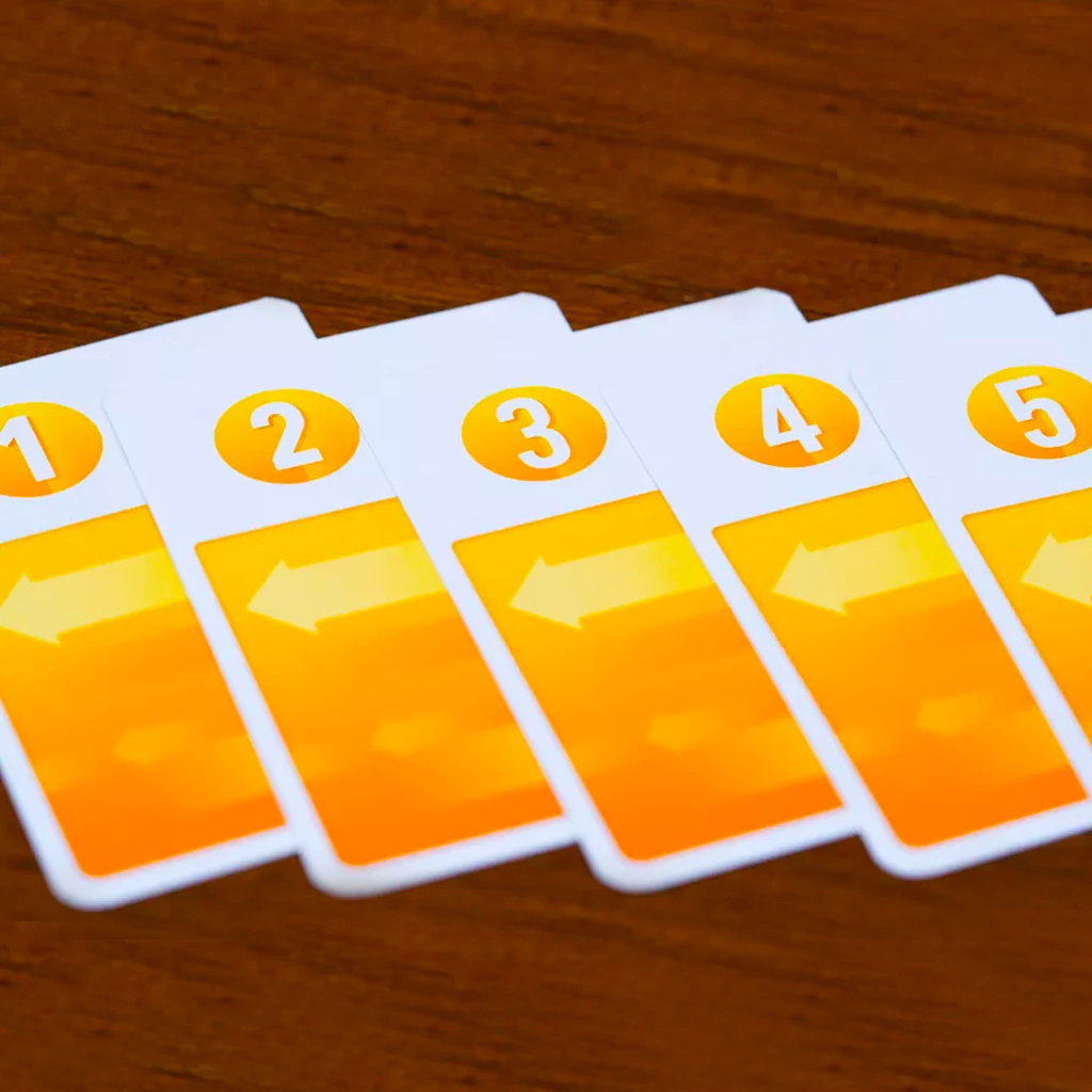 Empezaremos con una fila de cartas en el centro de la mesa, compuesta por tantas como jugadores haya. El turno consiste en escoger una carta de la mano y revelarla, de forma simultánea. Crearemos una nueva línea compuesta por las cartas ordenadas por valor, del más bajo al más alto.