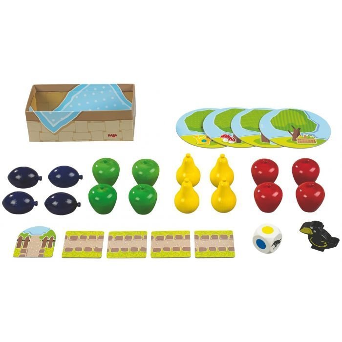 Los árboles del Frutal están cargados de frutas y el pícaro cuervo quiere hacerse con todas. Los jugadores intentan cosechar la fruta antes que el cuervo. Como indica el dado, pueden recolectar una fruta y colocarla en la cesta o colocar una casilla delante del cuervo. Cuando los niños recojan toda la fruta antes de que llegue el cuervo, ganan juntos.
