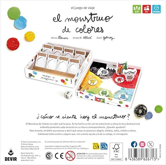 Vuelve el juego de El Monstruo de Colores… ¡Más compacto que nunca! Llega una nueva edición del juego infantil, basado en el popular cuento de Anna Llenas, con un formato ideal para llevar a cualquier parte y precio reducido. En esta versión, la caja se convierte un elemento más del juego. En el interior, una parte incorpora el tablero impreso, la otra, un inserto para acomodar los botes. ¡Jugar en un espacio pequeño ya no es un problema!
