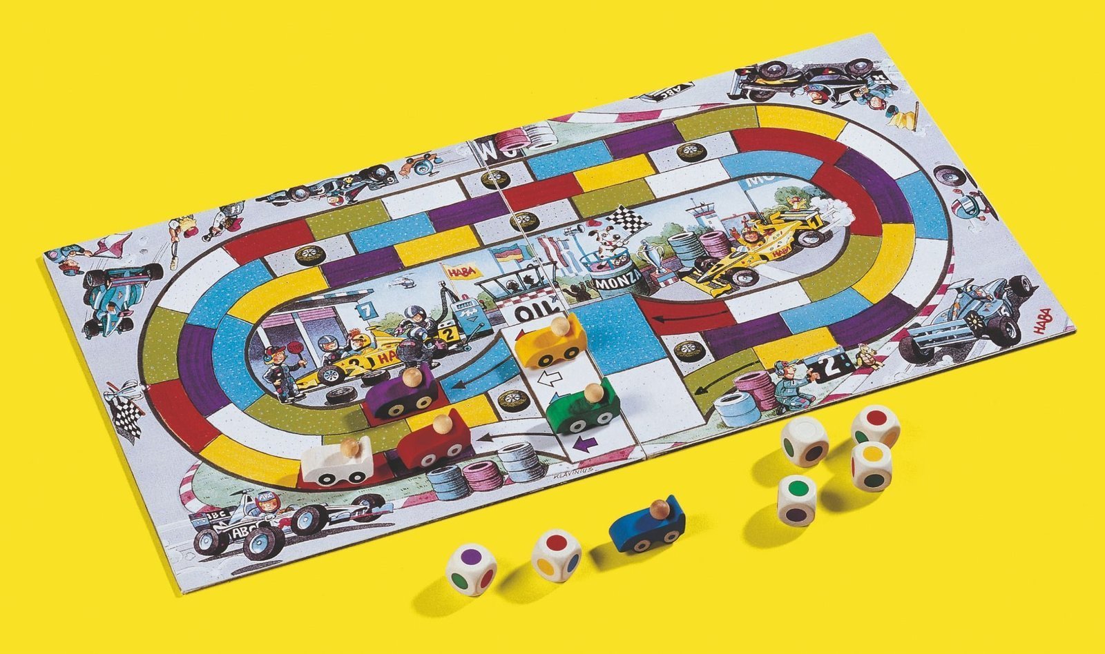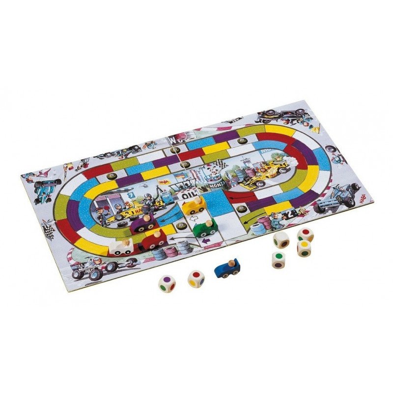 El juego consta de un tablero con el circuito, 6 cochecitos de madera y 6 dados con los 6 colores de los coches en sus caras.