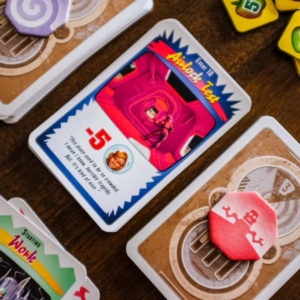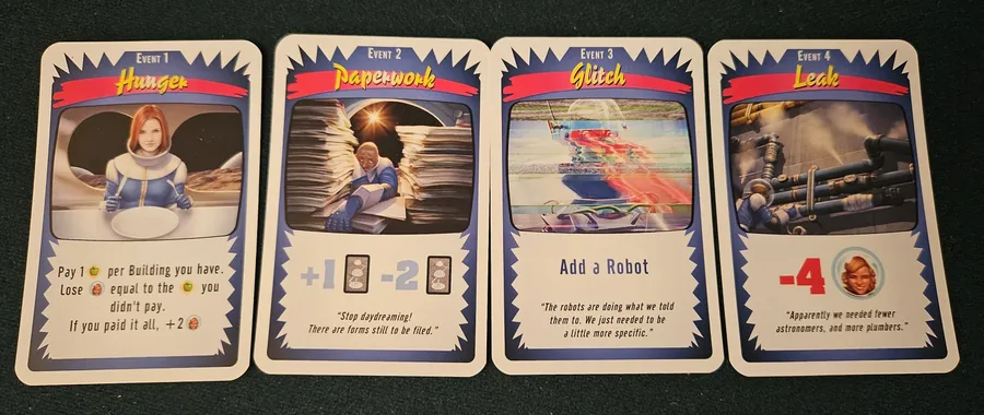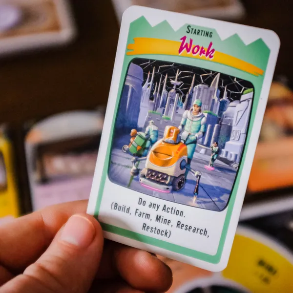 Más específicamente, cada turno se revela una carta del mazo compartido, que comienza con cuatro cartas de trabajo, dos cartas de problema y dos giros. Para el trabajo, cada jugador realiza una acción a su elección simultáneamente: minar para obtener dinero, cultivar para obtener alimentos, investigar para obtener cartas, construir un nuevo edificio o reabastecer cajas en los edificios. Los giros varían de una partida a otra. Trouble agrega una nueva carta de evento al mazo: hambre, papeleo, fallas, accidentes, filtraciones, cortes de energía; todo lo que pueda salir mal, saldrá mal, y luego, cada vez que se baraje el mazo, puede prepararse para todos esos eventos una vez más.