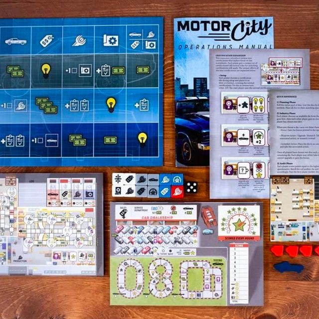 Motor City tiene un modo en solitario en el que intentas superar tu propia puntuación contra un auditor que dibuja dados y bloquea áreas de tu hoja. Su dificultad puede ajustarse fácilmente cambiando los colores de los dados durante la configuración, sin reglas añadidas.