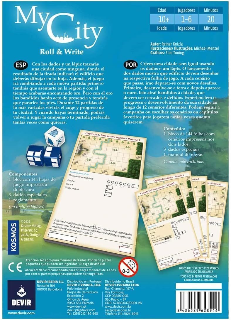 Lleva tu ciudad a lo más alto, ampliando sus barrios hasta convertirla en una gran metrópolis. My City Roll and Write es una versión totalmente independiente del título original en el que está inspirado, con una mecánica principal de roll and write (tirar dados y escribir). El juego propone una campaña de 12 partidas diferentes, divididas en 4 capítulos de 3 sesiones cada una. Además de intentar ganar cada partida, trata de ganar cada capítulo y el global de la campaña. Diseñado por el prolífico Reiner Knizia (autor del juego original My City y de muchos otros grandes títulos, como Mille Fiori, Tigris y Éufrates, Exploradores o El señor de los anillos), se puede disfrutar en solitario o en grupos de hasta 6 jugadores, a partir de 10 años.