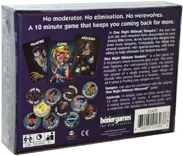 En One Night Ultimate Vampire, el sol acaba de ponerse y los vampiros han descendido sobre tu pequeña y tranquila ciudad, convirtiendo lentamente a los aldeanos en aún más vampiros. Afortunadamente, el pueblo tiene varios residentes con poderes especiales, ¡y la mayoría están dispuestos a ayudar a eliminar esta amenaza con colmillos!