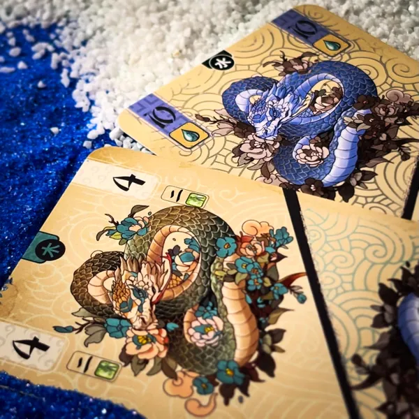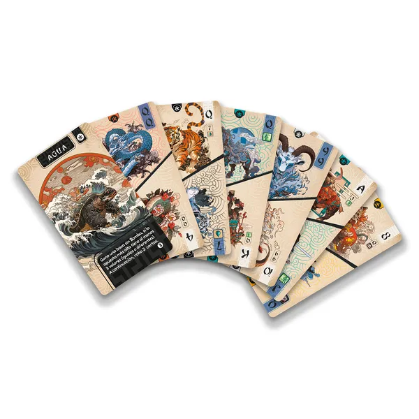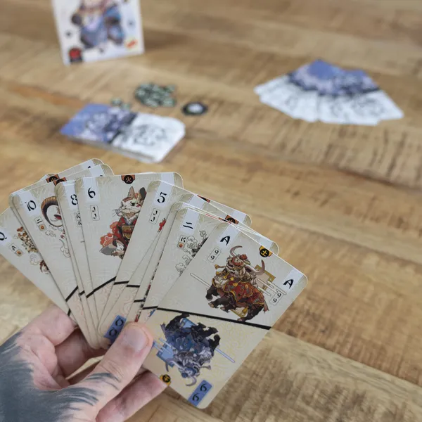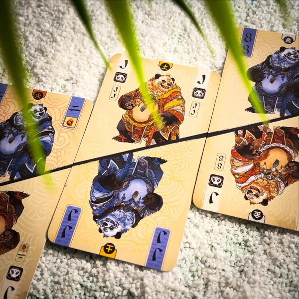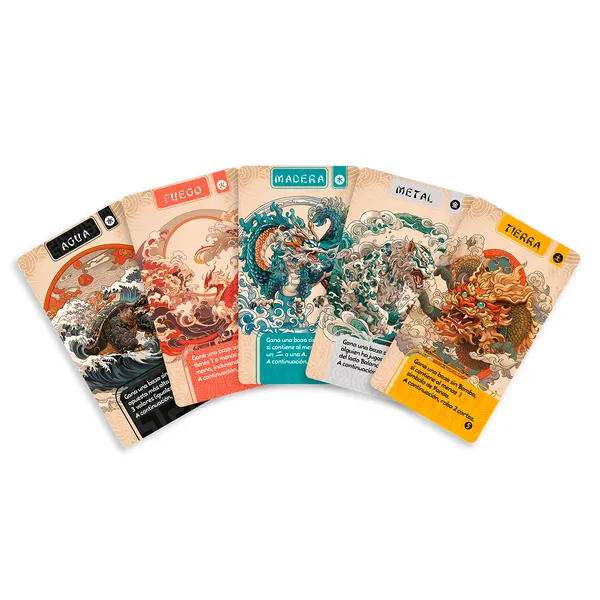 Las bazas se resuelven rápido y siempre mantienen la tensión. Hay cartas de elementos que ganan automáticamente la baza y te permiten robar más cartas, lo que añade aún más dinamismo a la partida. Cuando un jugador se queda sin cartas, anota puntos de bambú según las cartas que aún tengan sus rivales, y la ronda continúa hasta que casi todos han salido.