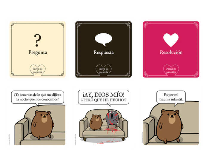 En cada partida competirás por construir la historia de amor más absurda y disparatada, digna de una comedia oscura. El juego se desarrolla combinando una carta de pregunta, una carta de respuesta y una carta de compromiso extravagante que da el toque final al relato.