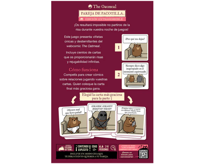 Un juego de cartas explosivo y lleno de ocurrencias, en donde cada partida te sumerge en dinámicas absurdas y cómicas que aseguran diversión inmediata. Con reglas sencillas y partidas rápidas, es la opción ideal para compartir entre amigos y convertir cualquier reunión en un momento inolvidable de risas y creatividad.