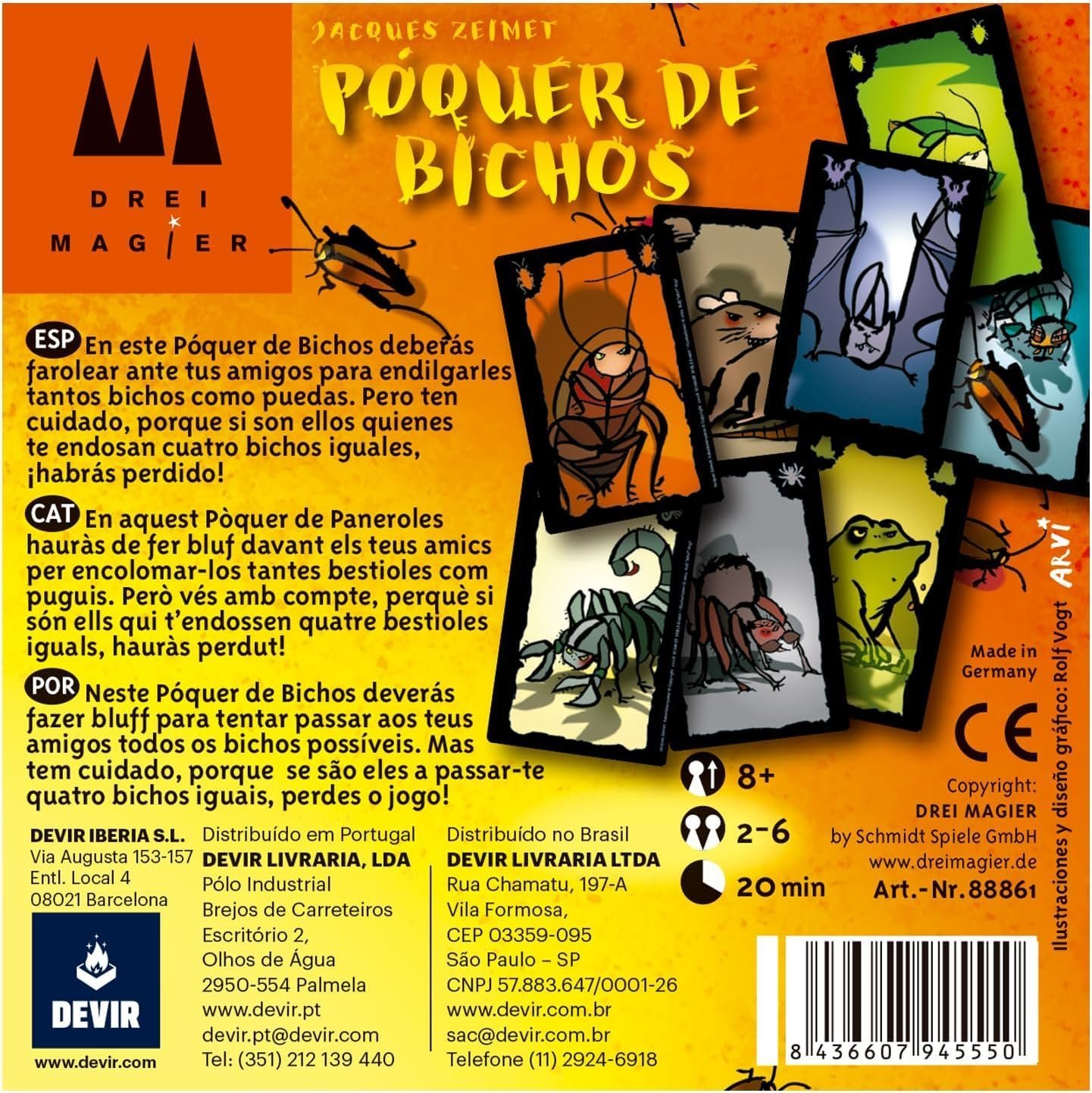 En este divertido juego de faroleo los jugadores intentan endosarse mutuamente tantas cartas como les sea posible. Esto lo harán ofreciendo una carta boca abajo a otro jugador y diciendo, al mismo tiempo, qué bicho aparece dibujado; ¡pero se puede decir la verdad o una mentira! Quien juzgue mal lo que dice el otro deberá quedarse con la carta. Y si alguien forma un póquer, ¡pierde la partida!