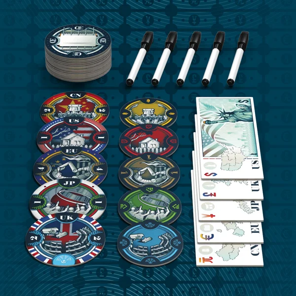 Es 2008 y la economía se está derrumbando. Tendrás que encarnar a una de las naciones más grandes del mundo e intentar salvar su economía imprimiendo dinero para rescatar las empresas. Habrá subastas para distintos tipos de empresas. Cada una tendrá un valor en puntos de victoria al final de la partida. Como banco central, puedes imprimir dinero para hacer la oferta que quieras. Tendrás, literalmente, un cheque en blanco en el que podrás escribir tu oferta. ¿99? Perfecto.¿99 mil millones? No hay problema. Consigue empresas para sumar puntos, pero ten cuidado: si eres el país que más ha gastado durante la partida, serás eliminado.¡ Asegúrate de controlar la evolución dela inflación!
