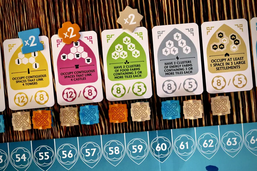 En cada turno, los jugadores roban una loseta de su reserva y la colocan estratégicamente en el tablero. Estas losetas representan la contribución de su clan a la reconstrucción del territorio. Rebirth premia la previsión estratégica y el juego táctico inteligente, con decisiones más difíciles que surgen a lo largo de la partida.
